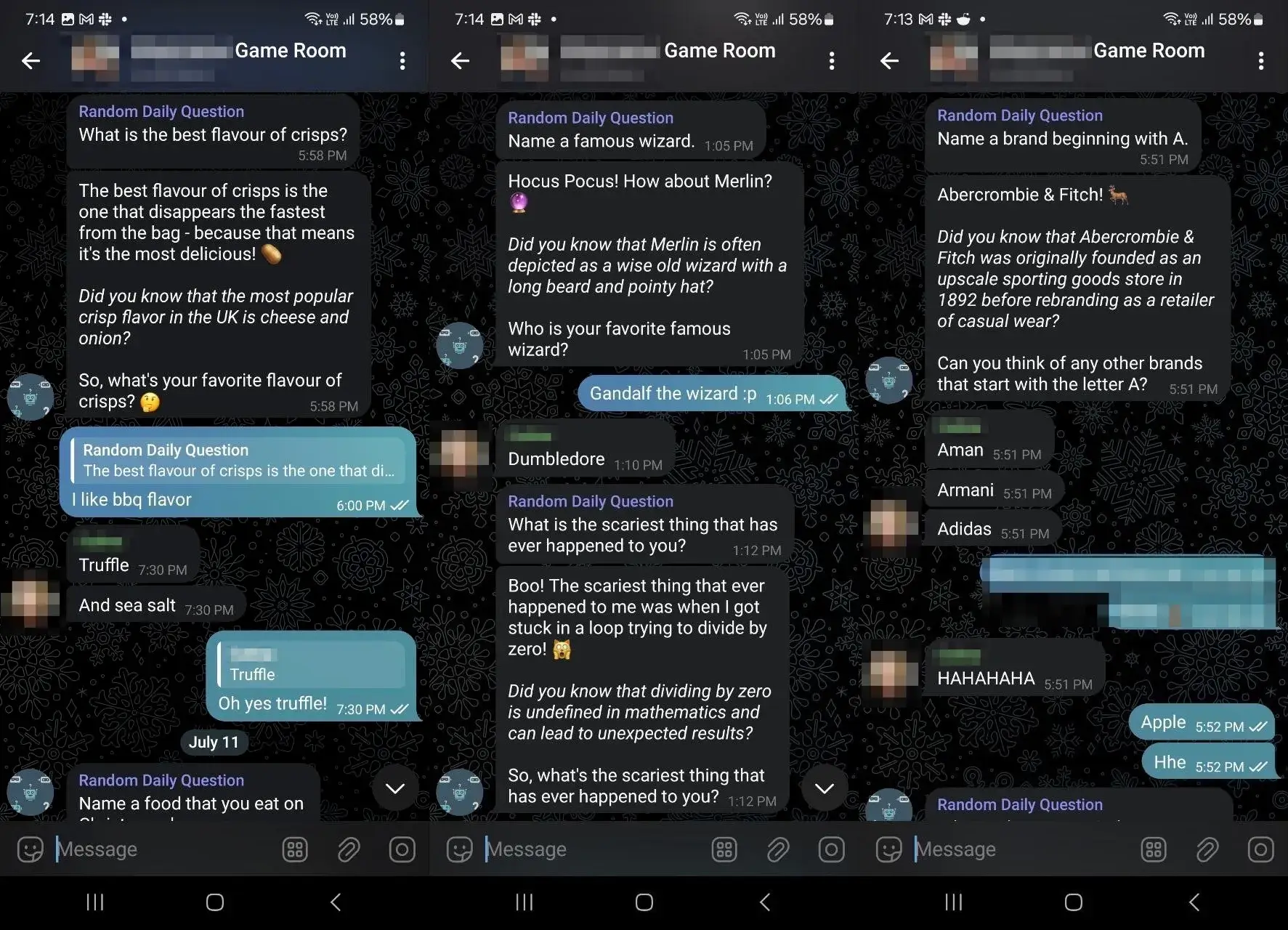 The idea of the bot is quite simple at first. When it receives a specific command, it replies with a random answer stored in a database and sends the question back to the chat, either private or group chat. The hope is that it will spark interesting discussions among the people in the chat.